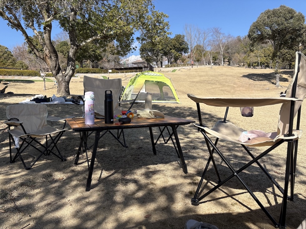 我が家は丘の広場の木陰近くにテントを設営しましたが、日差しを避けられて正解でした。木陰+テントの二重の日よけで、真夏でも快適に過ごせます。